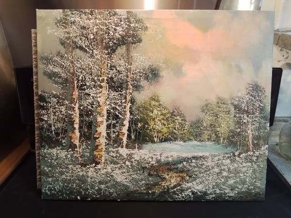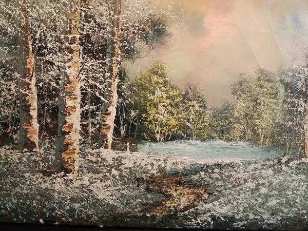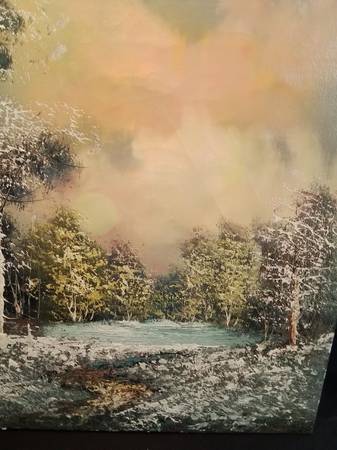Original oil painting on canvas. Depicts a mountain scene with a lake in the foreground. Signed "Wendell".