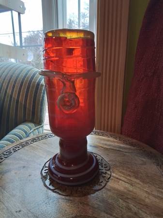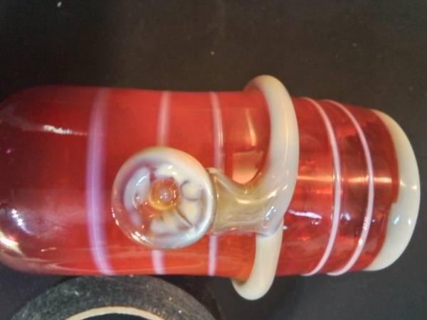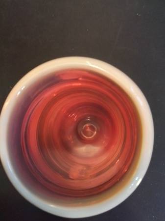 Unique, handblown glass chalice. Red and white glass with a swirling design. Features a small handle. Collectible piece. Perfect for display.