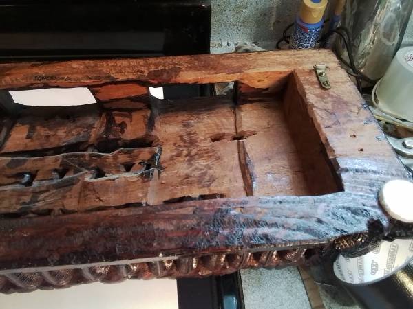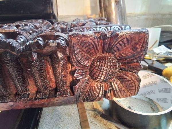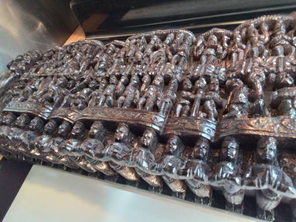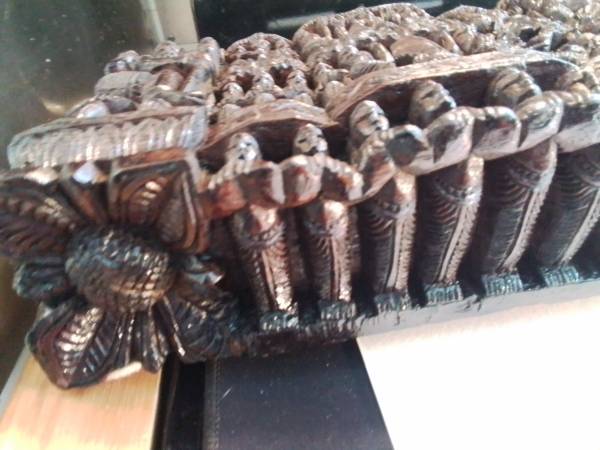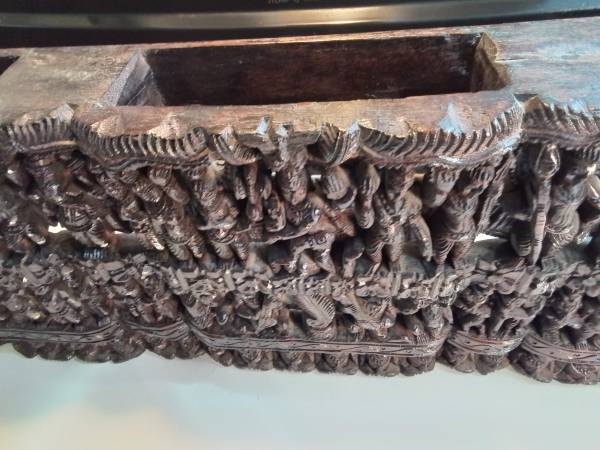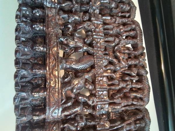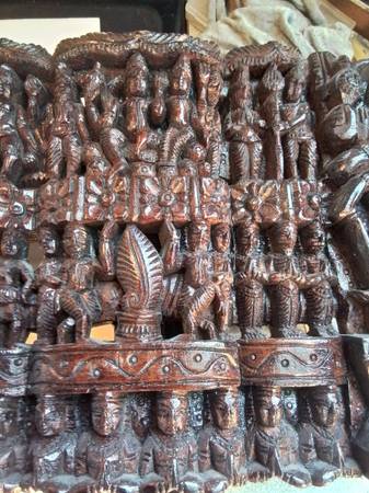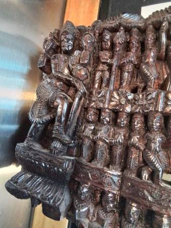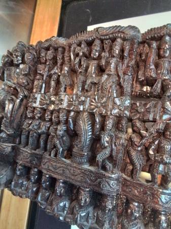 Large, detailed wood carving. Depicts numerous Hindu deities and figures. Rich, dark brown colour. Unique piece for collectors or home décor. Shows some signs of wear consistent with age.