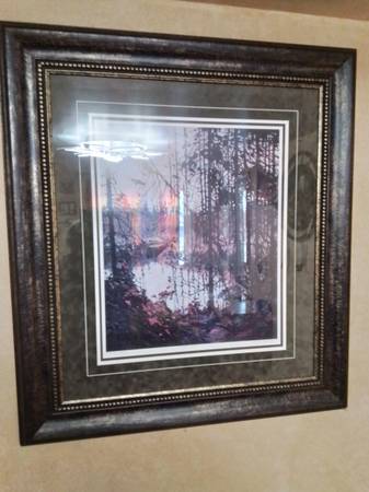 Framed art print of a forest scene with a river. It is in a black frame with a gold inner border.
