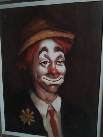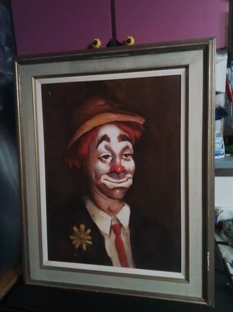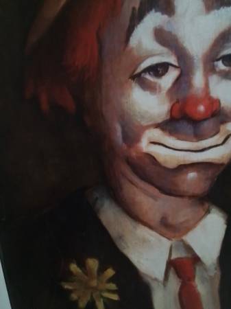 I am offering a large original oil on canvas painting titled "Clown" by Heith Covnell, created in April 1979. This unique piece of art captures a whimsical clown figure with vibrant colors and detailed brushwork, making it a standout addition to any art collection or a quirky decorative piece for your home. As a used item, it has character and a story to tell, adding depth to its artistic appeal.