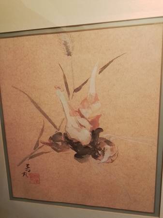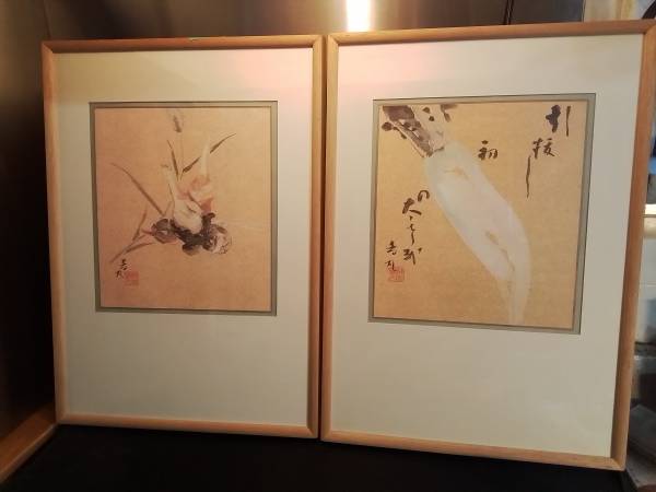 Two framed watercolour-style prints. Light beige matting. Wooden frames. Asian calligraphy visible. Depicts radish and possibly flowers.