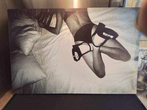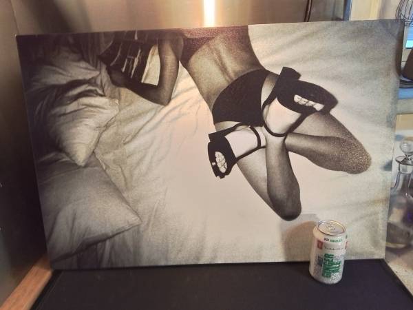 Black and white photo transferred onto canvas and stretched onto frame as seen. The piece is in excellent condition and measures 29.5" X 19.75" X 2"