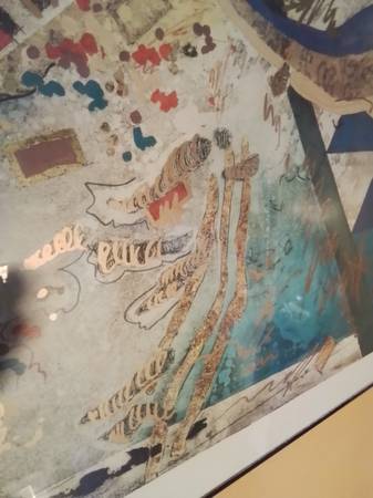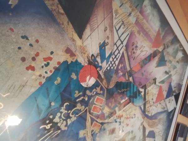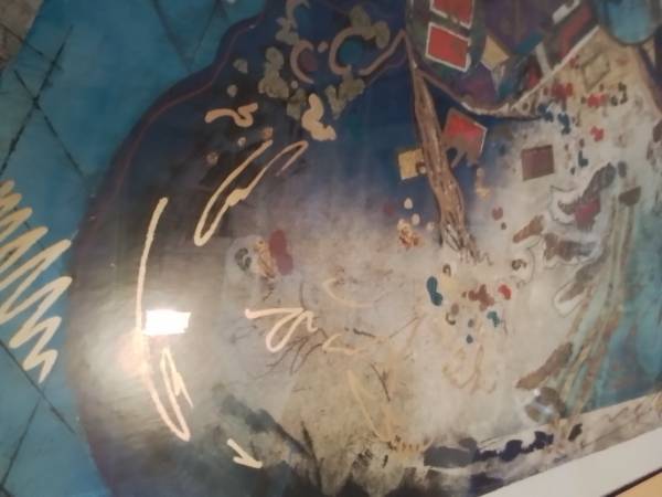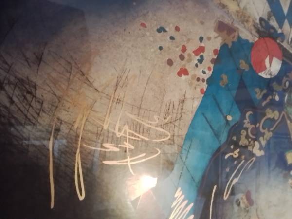 Large framed abstract print. Vibrant colours, gold accents. Signed by the artist. A statement piece for any room.
