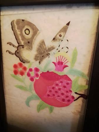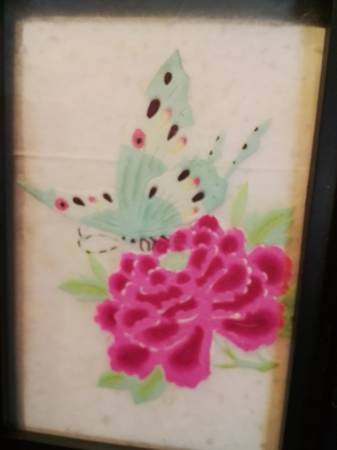 Set of Five Framed Butterfly and Flower Paper Cutouts Five framed artworks. Each features a colourful butterfly on a flower. Black frames. Unique and decorative. Pickup at Young Street and Steels Ave