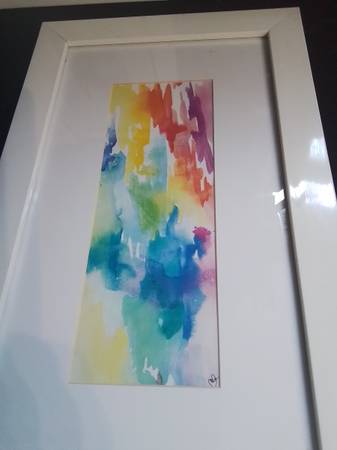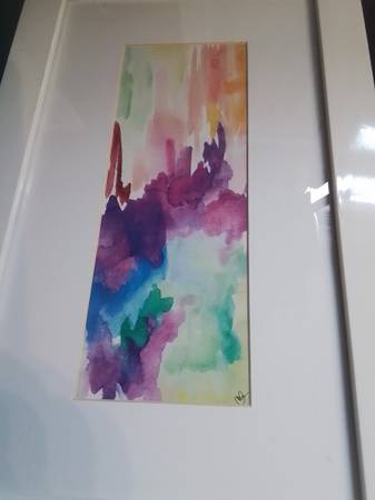 I'm offering three signed watercolour paintings, each framed in a simple white frame. The artwork features abstract designs with vibrant colours, perfect for adding a touch of contemporary art to any room. These are used, but the artwork is in great condition.