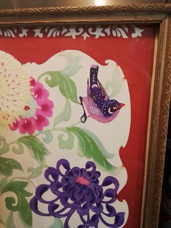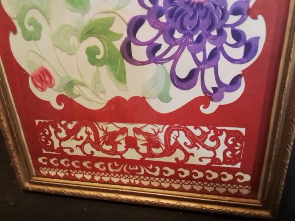 Beautiful framed artwork featuring intricate paper cut designs. Depicts flowers, birds, and dragons. Gold coloured frame. Unique piece for home decor.