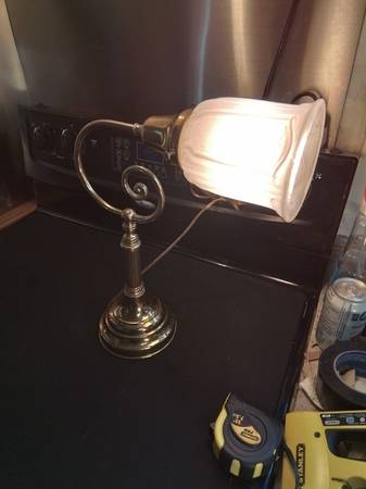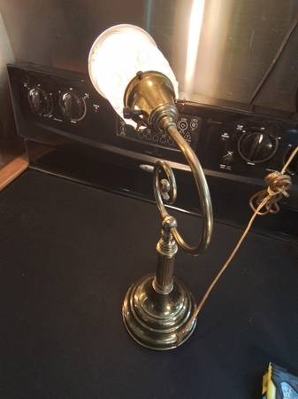 Antique-style brass desk lamp. Features a flexible gooseneck arm and a frosted glass shade. Ideal for a bedside table or office desk. Great accent piece.