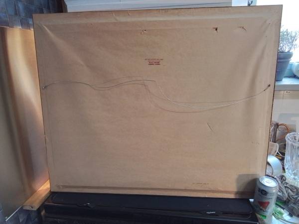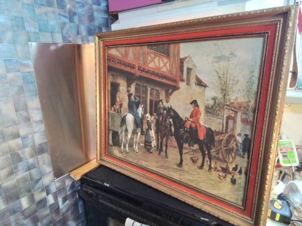 Large framed print depicting people on horseback outside a tavern. Ornate gold frame with red inner border. Shows a quaint village scene.