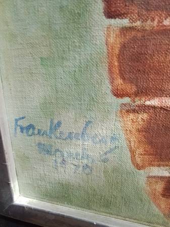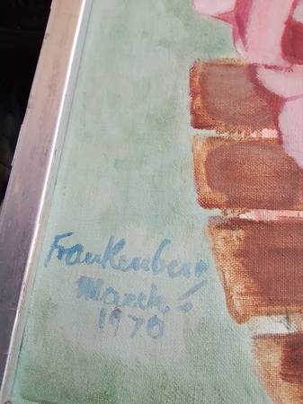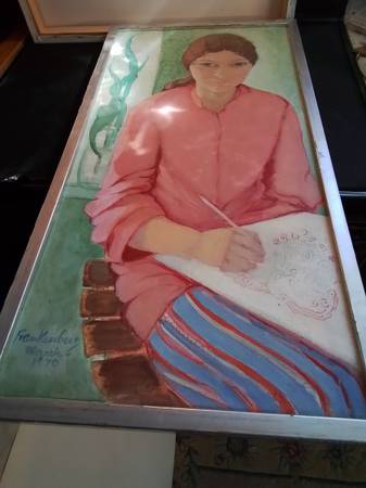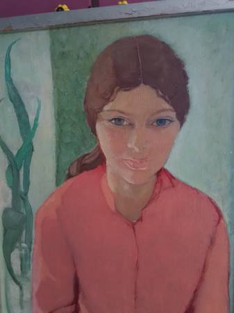 Original artwork. Framed painting of a young woman in a pink shirt. Features a plant in the background. Signed and dated. Aluminum frame.