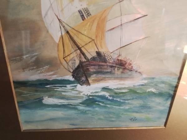 Lovely vintage Original framed watercolour painting. Depicts a sailing ship at sea. Gold coloured frame. Artist's signature visible in the bottom right corner.