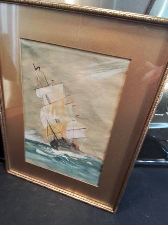 Vintage Framed Watercolor Painting of a Sailing Ship