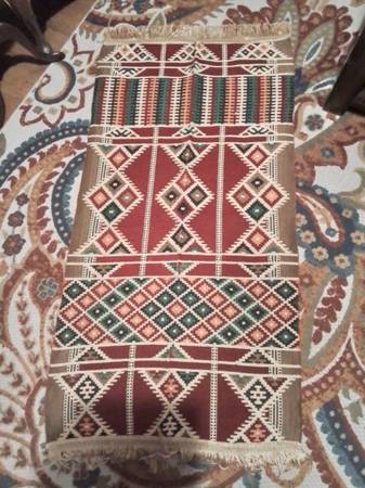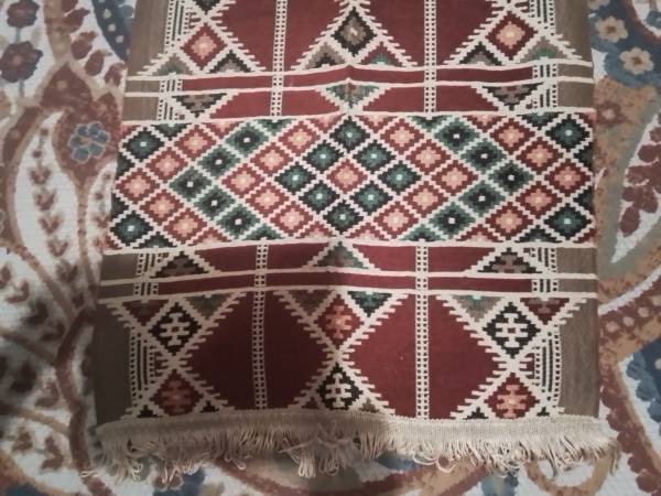 This is a handmade Middle Eastern prayer rug or Kilim, sized at 50x26 inches, featuring a vintage design with intricate patterns and vibrant colours. The rug has been previously cherished and is in good condition, ready to add a touch of cultural elegance to your space. It's not just a rug; it's a conversation starter!