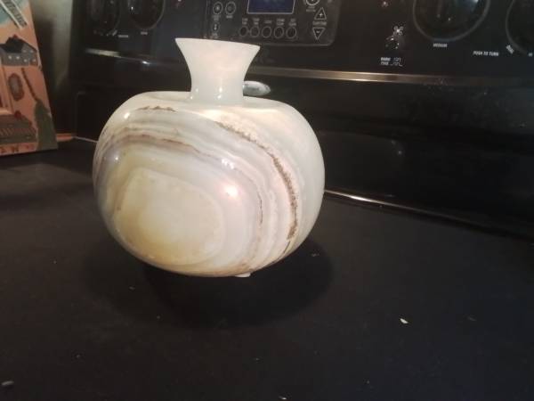 Beautiful round onyx stone vase. Features a narrow neck and swirling patterns. Small imperfection visible.
