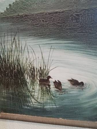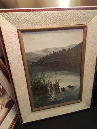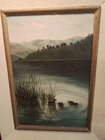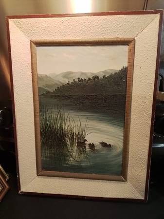 Vintage Landscape Painting - Ducks on a Lake by Angelo Del Lago Framed painting. Depicts ducks on a lake, with hills in the background. Shows some age and wear. Nice colours. Measurements 15.5 x 20...