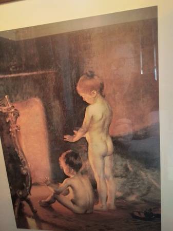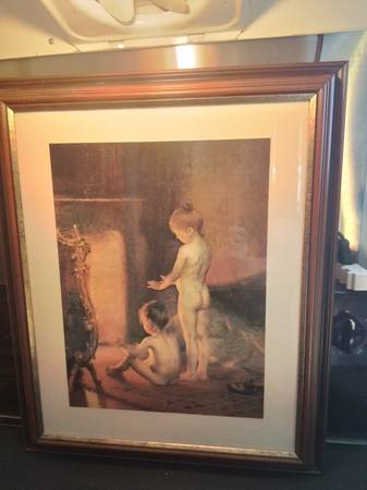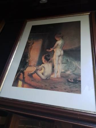 This is a vintage Paul Peel print titled 'After the Bath,' by Canadian artist Paul Peel (1860-1892). The frame is wood and the back of the print does have some wear and tear, so please consider that. This piece captures a tender, intimate moment, rendered with the soft, painterly style characteristic of Peel's work. Perfect for collectors or anyone looking to add a touch of classic elegance to their home.