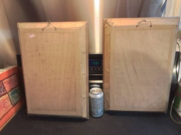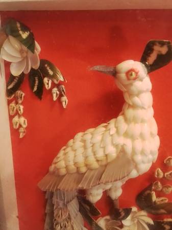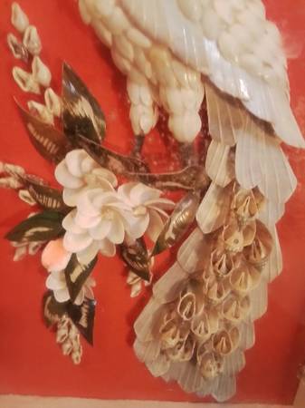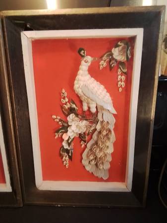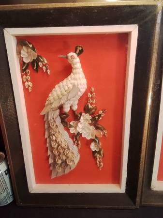 Two framed pictures. Each features a peacock made of seashells. Set against an orange background. Vintage style.