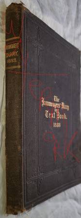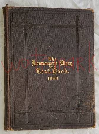 Rare, Original, 'The Ironmongers' Diary and Text Book. 1883', lIlustrated Advertisements, Hardcover, With Diary attributed to a Smith Family from St. Thomas, Ontario, 44 pink pages of Contents plus pages of Advertisements, 42 Cannon Street, London, England, 1882, 10 1/2” x 7 1/2”, in very good condition with wear including corner bumps, spine edge losses on covers, some spine separation from text, separation, & blank end page loss.