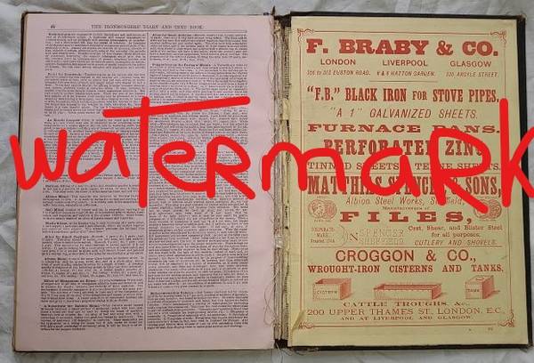 Some Colour Illustrated Advertisements include Hilman, Herbert & Cooper Penny Farthing Bicycles; Premier Works, Coventry, England Bicycles and Tricycles; Spong & Co., Manufacturers; Samuel Snell, Factor of Hardware, Bicycle & Tricycle Accessories & Fittings, Newington, London; American Maching Company, Manufacturers of Hardware Specialties; Wilson Bros. & Co. Manufacturers of Brass & Iron Bedsteads; F. Brary & Co., Black Iron for Stove Pipes, Furnace Pans; Matthias Spencer & Sons, Sheffield, Manufacturers of Files; Croggon & Co., Wrought-Iron Cisterns and Tanks, Cattle Troughs.