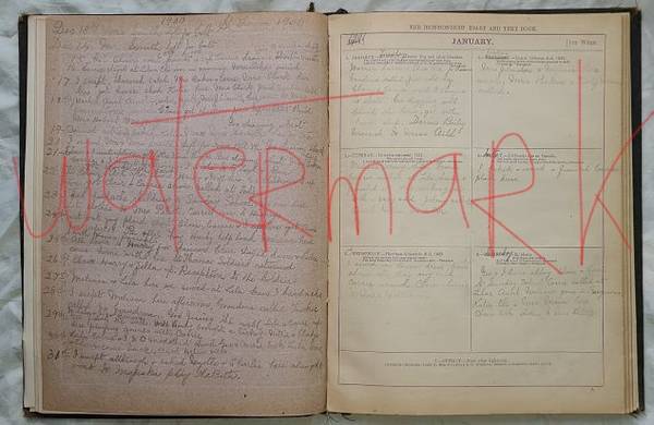 The diary section filled in with pencil script notations from January (crossing out 1883 to 1901) to December 30th. There are mentions of Darius Bailey married to Miss Ceill, Mrs. Johnston, Mrs, Baker, Willie Dixon, Janet Gray, Mrs. Petitt, Mrs. Clark, Mrs. Howarth, Clair & Carrie (possibly daughters), George or Eli (possible husband), Warren Smith, John Secord, Chester Lindsay buried, got photo frame from Hopkin's $1.50, household duties including a lot of sewing, pickling & canning peaches & tomatoes, churning butter, baking a cake, pie & oatmeal cookies, Queen Victoria's death.