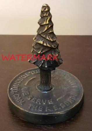 Original Canadian Brass Paperweight, marked on the base, 'The A.E. Go rdon Lu mber Co. Ltd., Toronto. Can., We Serve, We Serve' with a figural Evergreen Tree in the centre, great patina, c1927, 2 1/2” H x 1 3/4” diameter, with some wear, commiserate with its age.