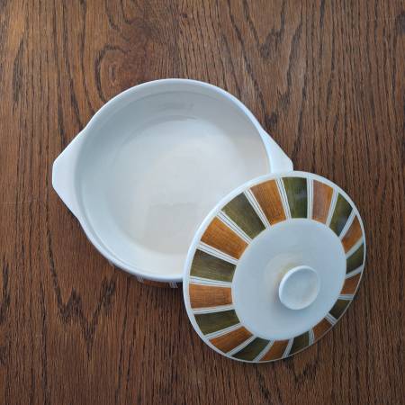 This dish was likely made around 1956 as the crown in the centre of their back stamp was added to some of their marks in 1956. Thus, you could conclude this gorgeous tureen is about 69 years old.
