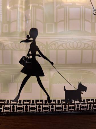 Vintage Harrods Rarely Found Shopping Bag Harrods shopping bag with woman walking a dog up for sale here Photos will say it all. Mint condition Roughly 12 inches wide and 15 inches tall Zipped...