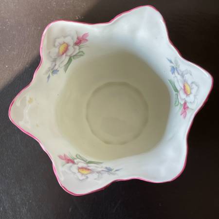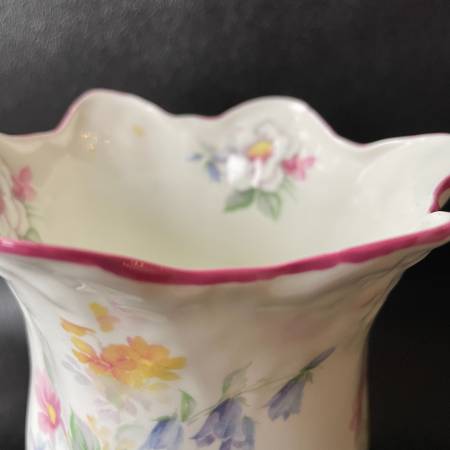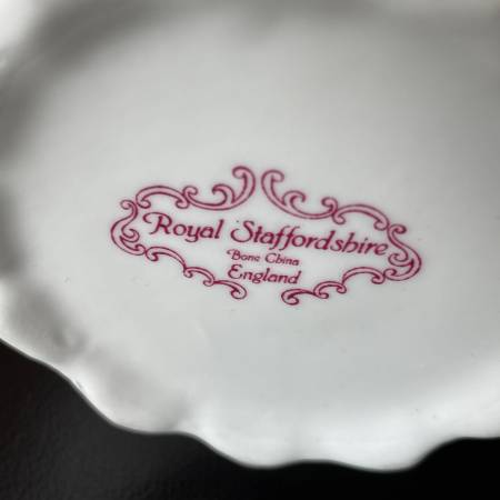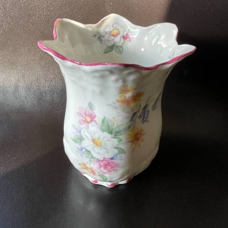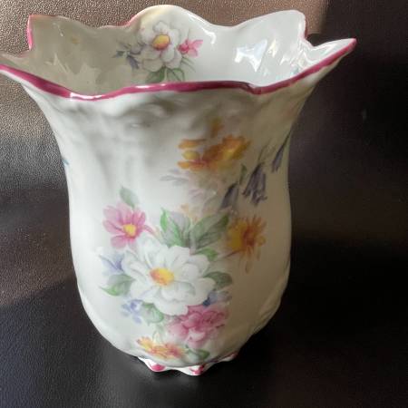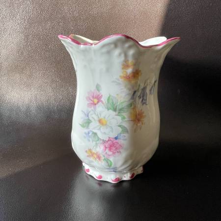 Selling a vintage Royal Staffordshire England Bone China Floral Vase in pristine condition. This is a thin beautifully crafted vase. In mint condition. No chips, crazing or fading. Scalloped edges and moulded porcelain with delicate floral pattern. Approx. 5-3/4" high and 5" across at its widest.
