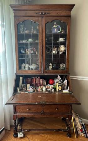 English oak secretary desk featuring oak and barley twist legs, and leaded glass bookcases on top. In excellent condition although as you'd expect with a piece this old, the drawers take a little...