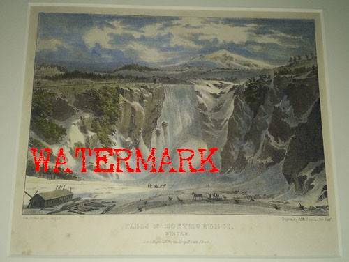 ORIGINAL Steel LITHOGRAPH of CANADIAN LANDSCAPE, Marked in the middle, 'Falls of Montmorenci., Winter, Day & Haghe lith.rs to the King, 17, Gate Street'.; on the left, 'On Stone by L. Haghe', & on the right, 'Drawn by RSM Bouchette Esq.', c1850's, Acid free matting: 10 1/2" x 8 1/2"; Lithograph: 7 1/2" x 5 1/4".
