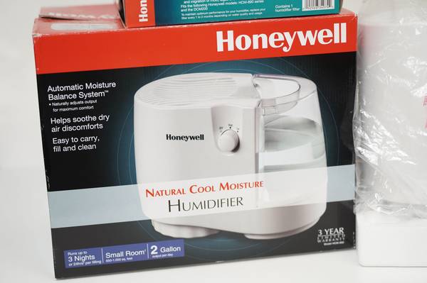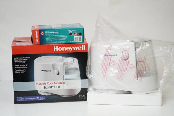 Sell one Honeywell cool moisture humidifier in white, lightly used in pet free and smoke free home, still in excellent condition with original box, see photos for actual item.