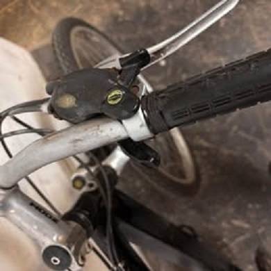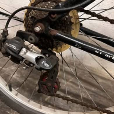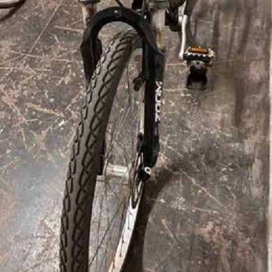 Medium frame size it appears to be aluminum, full suspension, front disc brakes, 21 gears and foot hold pedals for better control riding