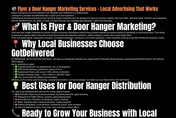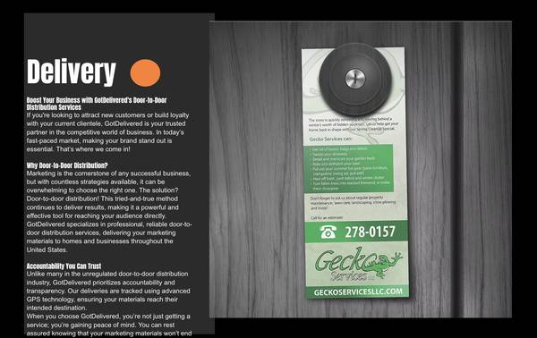Professional FLYER Distribution Services GPS tracked We offer professional flyer delivery for all of Canada. We deliver FLYERS, Door Hangers, Postcards and more.... *Election *Pizza *Restaurants...