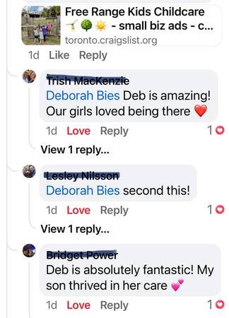 I have provided all levels of childcare in my previous upper beach neighbourhood for 14 years, and with that, have developed a strong sense of community connection; one that I am both proud and grateful for. I take pride in my work, and love what I do!