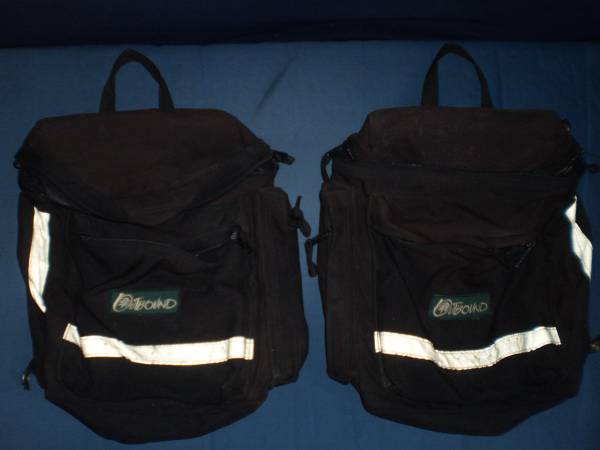 Panniers -------- Outbound Pannier Bags x 2, 9x11 inches $75 for BOTH Voyageur Pannier Bag, 14x10 inches $40 Handlebar Bags -------------- Handlebar Bag with Quick Release, make unknown, NEW $35