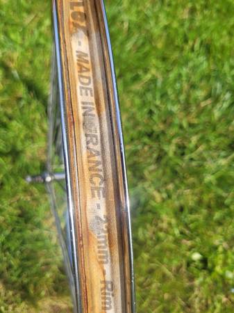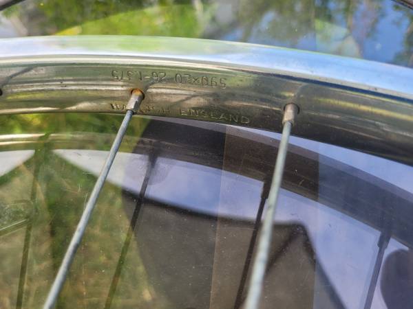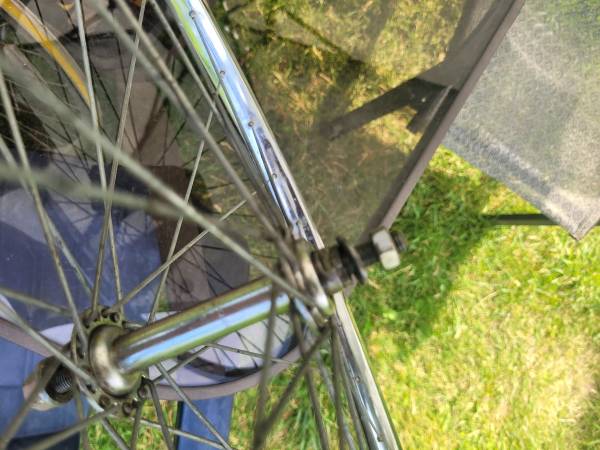The chrome plating is in pretty good condition for the 1970-s wheel. Wheel spins straight and was checked in a truing stand.