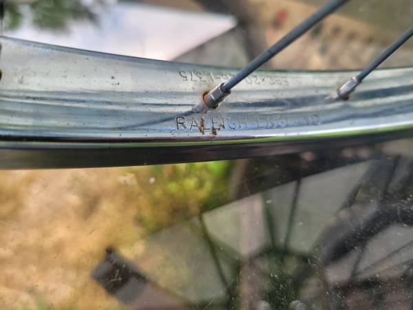 - Rim - Chrome rim branded by Raleigh, made by Sturmey Archer in England.