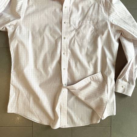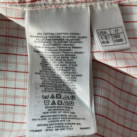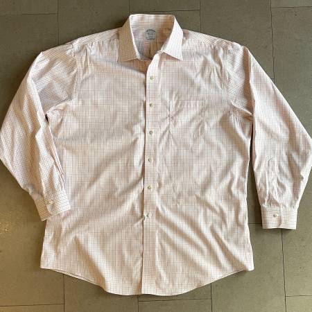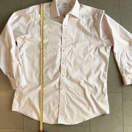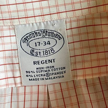 Selling a pristine Brooks Brothers Men's Regent Cotton Dress Shirt-White/Orange squares-Size 17-34 (XL). Slight stretch. Beautiful quality. 96% Supima Cotton, 4% Lycra. Measurements lying flat: Pit...