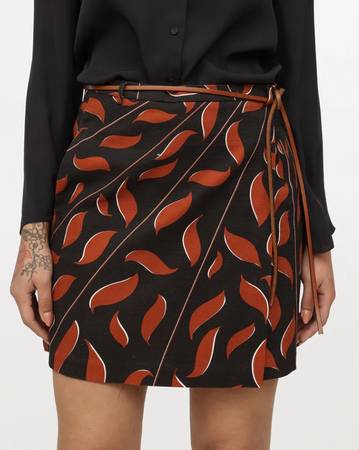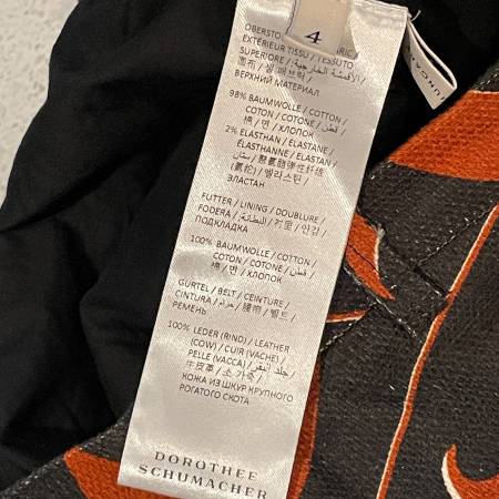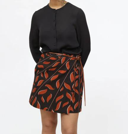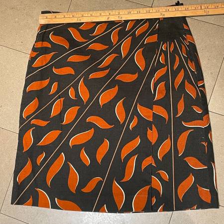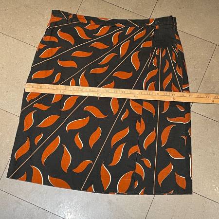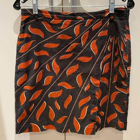 Stunning Black and Orange Designer Dorothee Schumacher Wrap mini-skirt with lining. This is made of a gorgeous cotton fabric with 2% Elastane so has a bit of stretch. Lining is 100% cotton. Hidden side zipper and on seam pockets. Beautifully made skirt. Very gently used. In pristine condition. Made in Hungary. Size 4 which is like a Large.