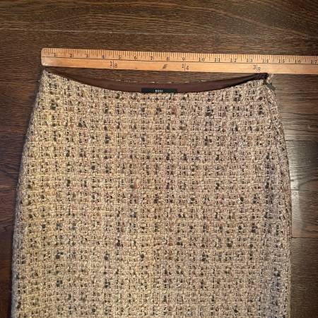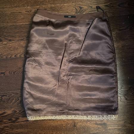 Selling a Hugo Boss Tweed Wool blend Miniskirt in Brown/Tan-Size 2. This skirt is fully lined with a hidden side zipper.