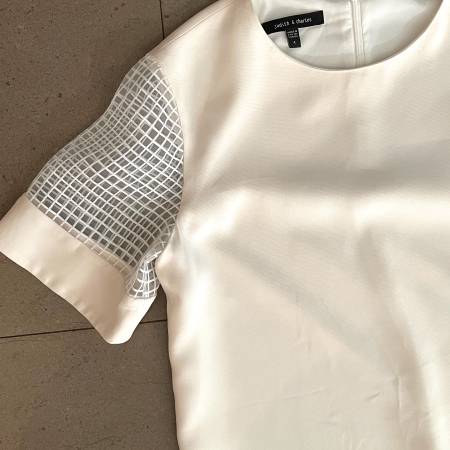 Selling a gorgeous NEW (no tag) Judith & Charles Cream Silk Sheath Dress-Size 4. Fully lined, with mesh sheer short sleeves. 95% silk, 5% Elastane. Back invisible zipper.