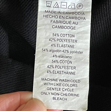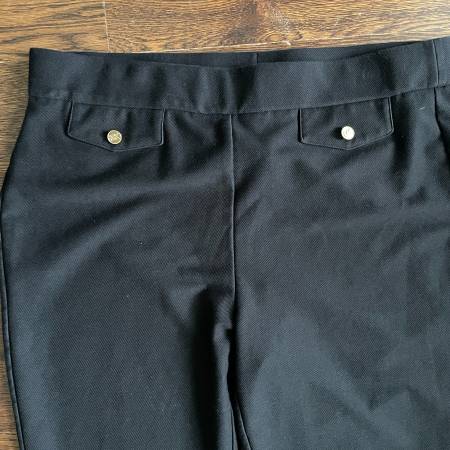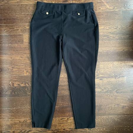 Selling a pair of Michael Kors Black Womans Dress Pants with Gold buttons-Size XL. These are pull on pants with faux pockets. Gently used. Material: 54% Cotton, 42% Polyester, 4% Elastane