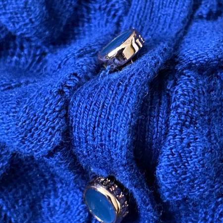 Selling a Ted Baker Yayoi Royal Blue Cotton/Cashmere Knit 3/4 Sleeve Sweater-Size 2/4. Have 3 Rose Gold Buttons in the back. 3/4 sleeve. 95% cotton, 5% Cashmere.