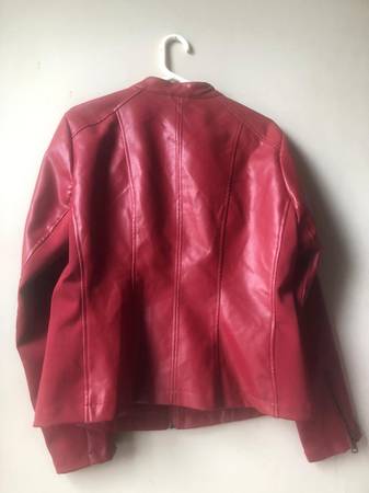 BRAND - SUZY SHEER MATERIAL - FAUX LEATHER COLOR- BRIGHT BOLD RED COLLAR- SIMPLE ROOUND COLOR WITH NO LAPELS ZIPPER- FULL LENGTH FRONT ZIPPER SLEEVES- LONG SLEEVES SIZE- 2XL Please contact me incase...