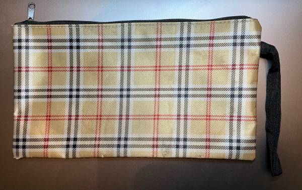 Brand new, lovely tartan Make Up Bag, made with cheerful gold tartan fabric with white vinyl lining.