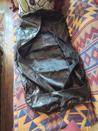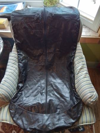 Black Genuine Leather Garment Bag Black leather garment bag. Full-length zipper closure. Multiple zippered pockets. Good for travel. Measurements 19 x 43 Great Vintage Condition Pickup at Young...