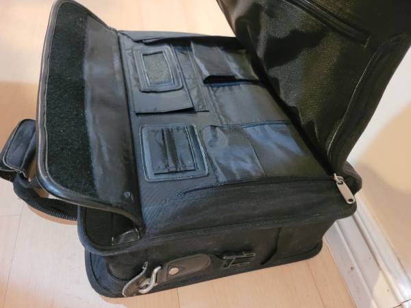 Large padded Jetliner bag with good protection for laptop, removable devider in a large compartment, plus additional compartments for accessories and documents. With shoulder strap.