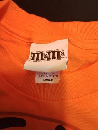 This is a new M&M's orange character youth size large T-shirt, perfect for any fan! This shirt is brand new and features a vibrant graphic of the iconic M&M's character. It’s made from 100% cotton, ensuring comfort and durability. This unique piece would make a sweet addition to any child's wardrobe.