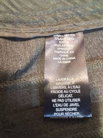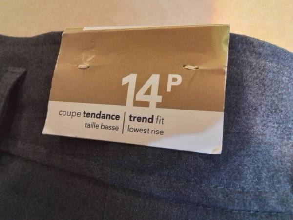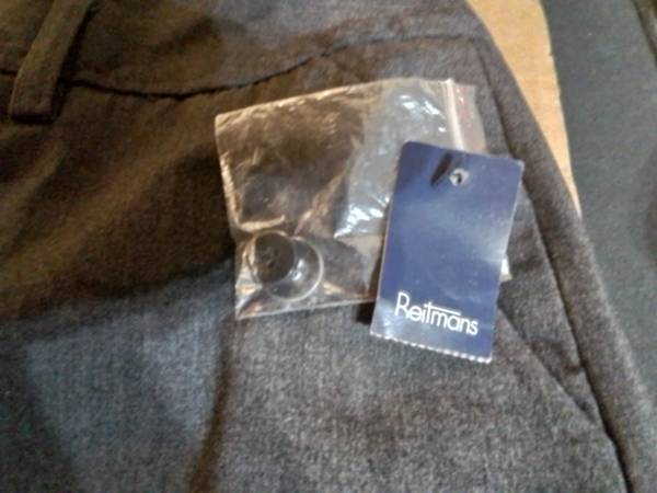These are a new pair of Reitmans Trend Fit - Lowest Rise dress pants in size 14P. They are a stylish addition to any wardrobe, made from 63% polyester, 33% rayon, and 4% spandex for a comfortable fit. The pants come with a spare button, still sealed in its original packaging.