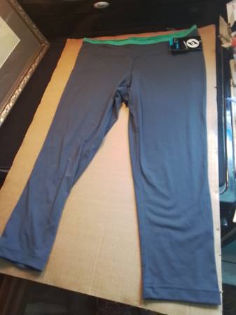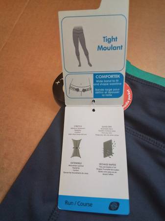 These Sportek Platinum capri-length running tights in size large are new with tags, featuring a wide band to fit and shape your waistline, four-way stretch FÄMFLX fabric that holds and shapes your body, and a multimedia pocket.